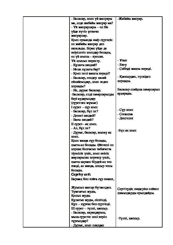 Қолданатын құрал - жабдық:ақ,сұр қоянның суреттері,түлкі мен қасқырдың суреттері.