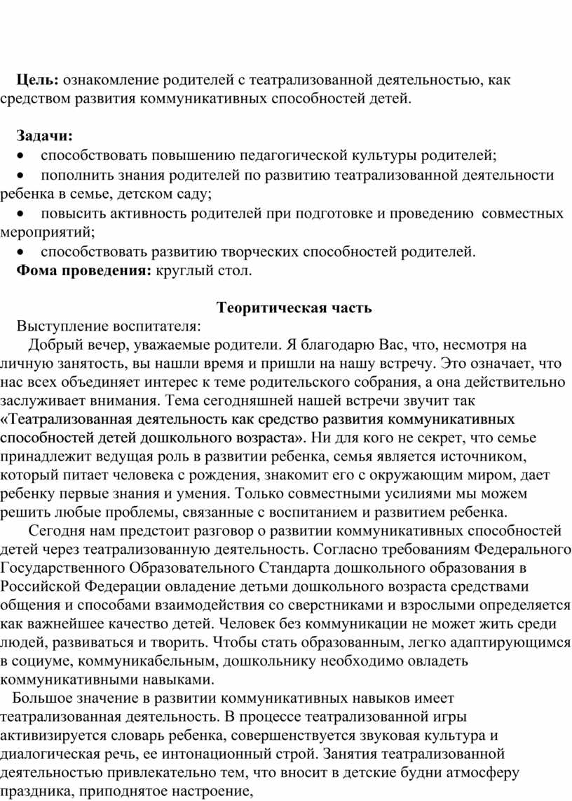 Цель: ознакомление родителей с театрализованной деятельностью, как
