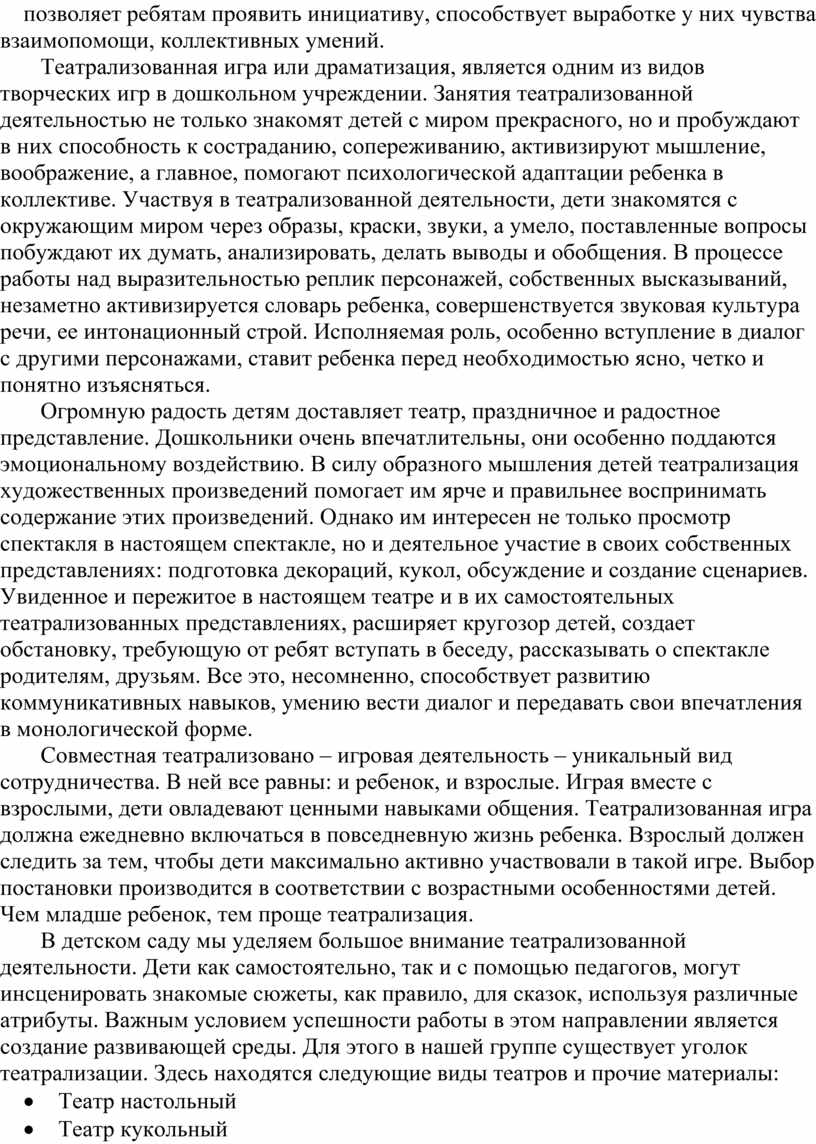 Совместная театрализовано – игровая деятельность – уникальный вид сотрудничества. В ней все равны: и ребенок, и взрослые. Играя вместе с взрослыми, дети овладевают ценными навыками общения. Театрализованная игра должна ежедневно включаться в повседневную жизнь ребенка. Взрослый должен следить за тем, чтобы дети максимально активно участвовали в такой игре. Выбор постановки производится в соответствии с возрастными особенностями детей. Чем младше ребенок, тем проще театрализация.