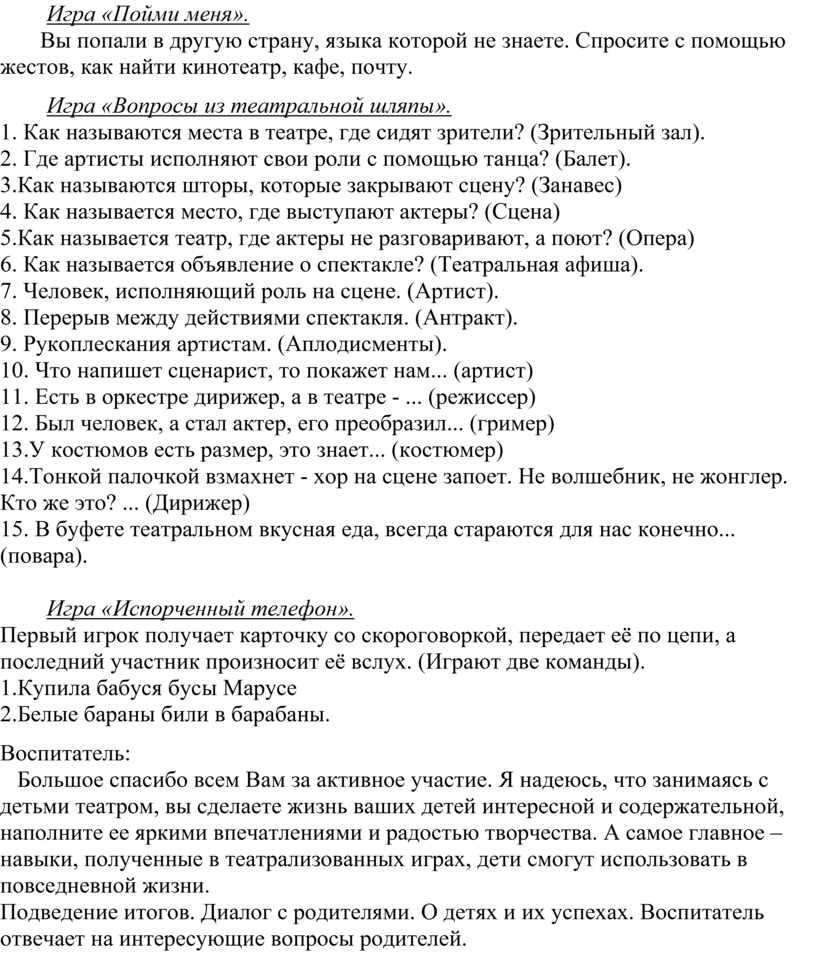 Большое спасибо всем Вам за активное участие. Я надеюсь, что занимаясь с детьми театром, вы сделаете жизнь ваших детей интересной и содержательной, наполните ее яркими впечатлениями и радостью творчества. А самое главное – навыки, полученные в театрализованных играх, дети смогут использовать в повседневной жизни.