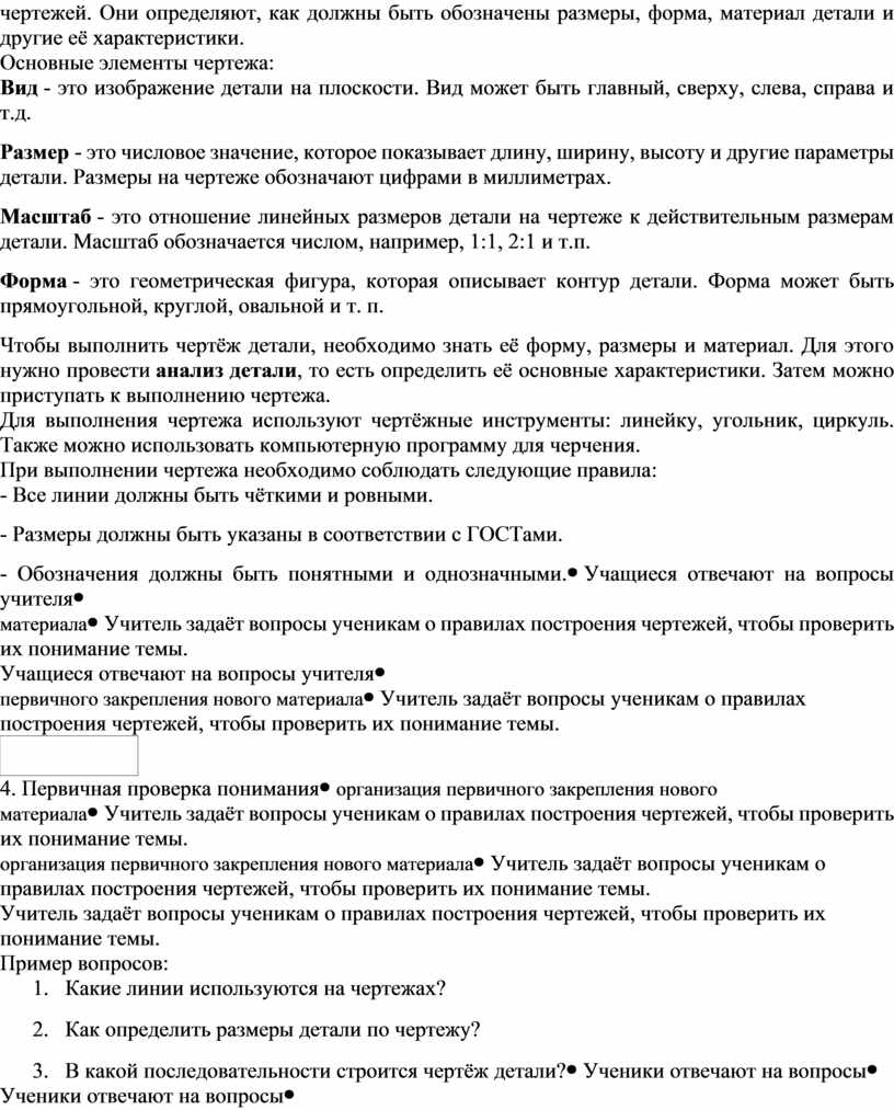 Учитель задаёт вопросы ученикам о правилах построения чертежей, чтобы проверить их понимание темы. Пример вопросов: