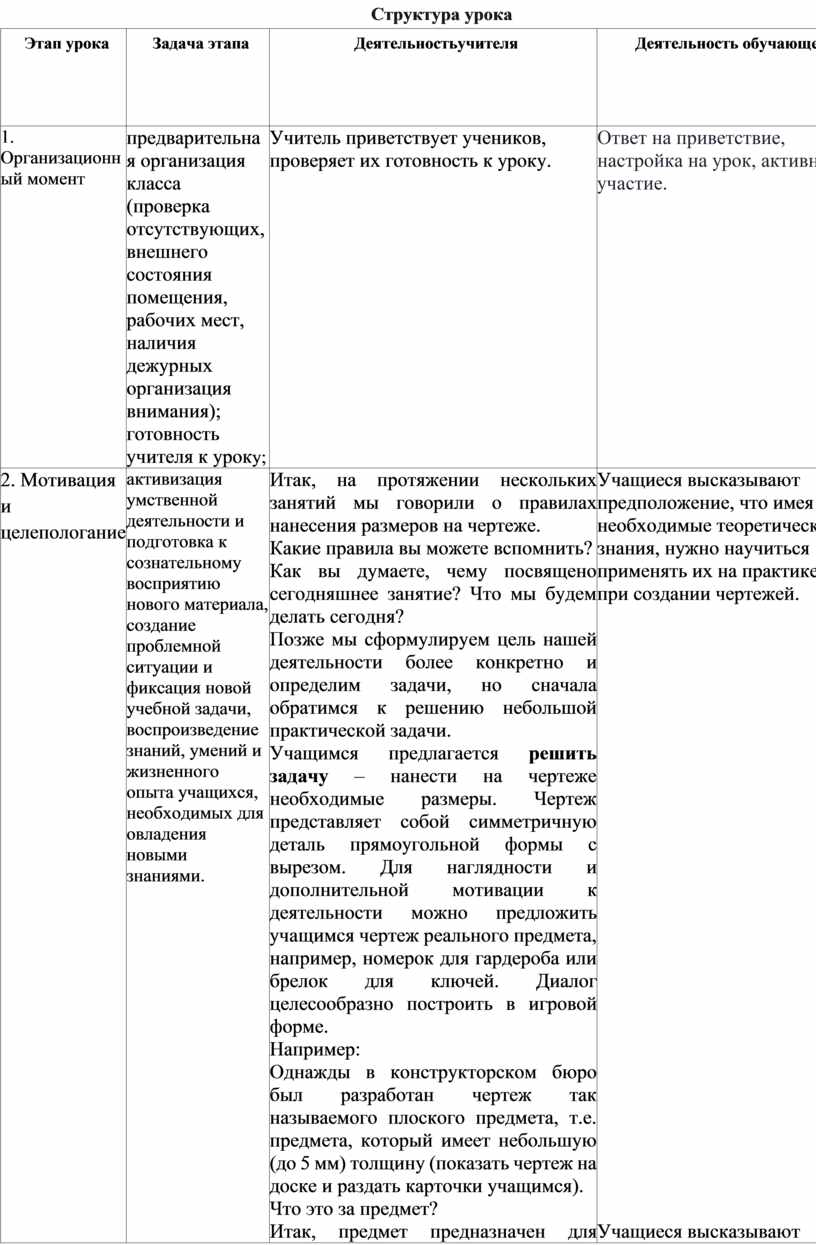 1) Обучающая: сформировать представление о чертеже как способе графического изображения деталей, научить читать чертёж, определять по нему размеры и форму детали, а также выполнять чертёж по образцу. Формировать представление о профессиях, связанных с черчением и их востребованностью на рынке труда.