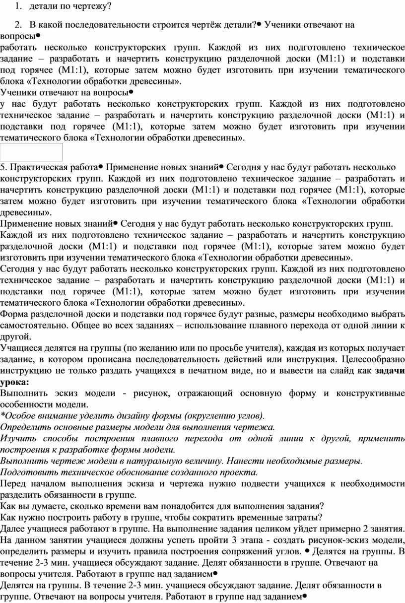 Сегодня у нас будут работать несколько конструкторских групп. Каждой из них подготовлено техническое задание – разработать и начертить конструкцию разделочной доски (М1:1) и подставки под горячее (М1:1), которые затем можно будет изготовить при изучении тематического блока «Технологии обработки древесины». Форма разделочной доски и подставки под горячее будут разные, размеры необходимо выбрать самостоятельно. Общее во всех заданиях – использование плавного перехода от одной линии к другой. Учащиеся делятся на группы (по желанию или по просьбе учителя), каждая из которых получает задание, в котором прописана последовательность действий или инструкция. Целесообразно инструкцию не только раздать учащихся в печатном виде, но и вывести на слайд как задачи урока: Выполнить эскиз модели - рисунок, отражающий основную форму и конструктивные особенности модели. *Особое внимание уделить дизайну формы (округлению углов). Определить основные размеры модели для выполнения чертежа. Изучить способы построения плавного перехода от одной линии к другой, применить построения к разработке формы модели. Выполнить чертеж модели в натуральную величину. Нанести необходимые размеры. Подготовить техническое обоснование созданного проекта. Перед началом выполнения эскиза и чертежа нужно подвести учащихся к необходимости разделить обязанности в группе. Как вы думаете, сколько времени вам понадобится для выполнения задания? Как нужно построить работу в группе, чтобы сократить временные затраты? Далее учащиеся работают в группе. На выполнение задания целиком уйдет примерно 2 занятия. На данном занятии учащиеся должны успеть пройти 3 этапа - создать рисунок-эскиз модели, определить размеры и изучить правила построения сопряжений углов. |