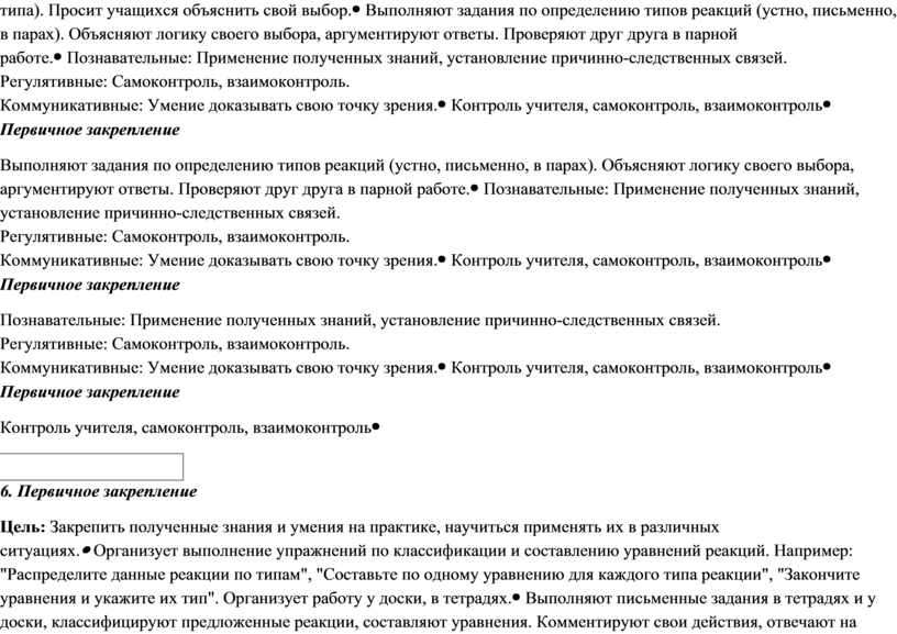 Выполняют задания по определению типов реакций (устно, письменно, в парах). Объясняют логику своего выбора, аргументируют ответы. Проверяют друг друга в парной работе. |