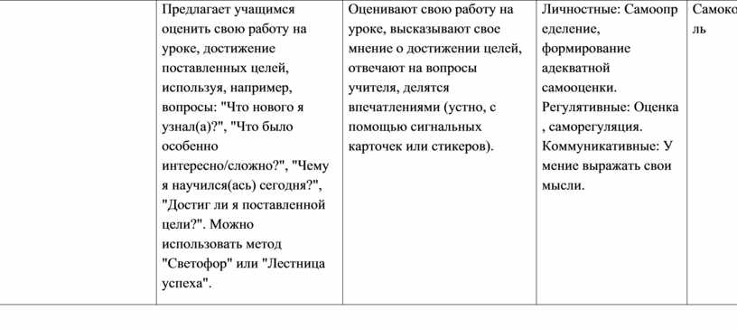 Предлагает учащимся оценить свою работу на уроке, достижение поставленных целей, используя, например, вопросы: "Что нового я узнал(а)?", "Что было особенно интересно/сложно?", "Чему я научился(ась) сегодня?", "Достиг ли я поставленной цели?". Можно использовать метод "Светофор" или "Лестница успеха". |