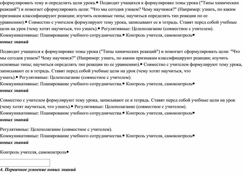 4. Первичное усвоение новых знаний Цель: Изучить определения и признаки четырех основных типов химических реакций; научиться приводить примеры. |