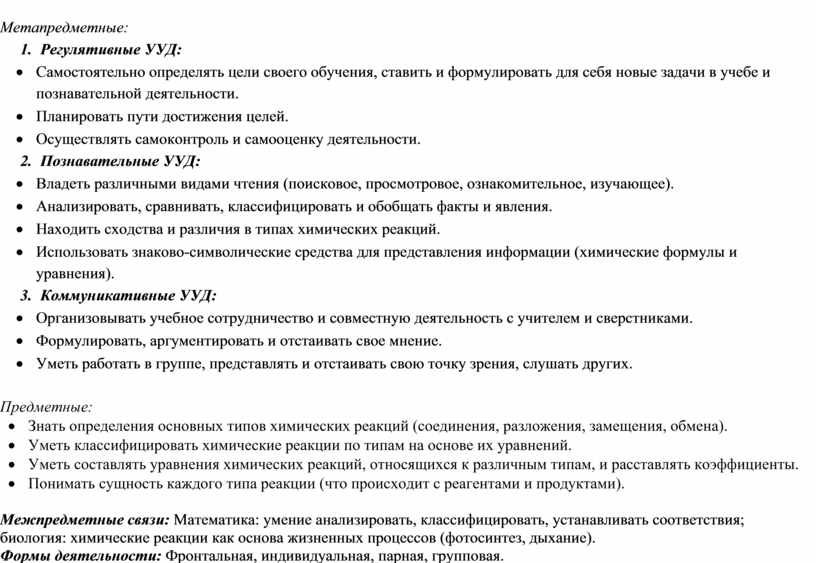 Межпредметные связи: Математика: умение анализировать, классифицировать, устанавливать соответствия; биология: химические реакции как основа жизненных процессов (фотосинтез, дыхание).