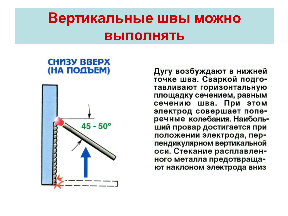 Вначале наплавляют полочку на свариваемые кромки, а затем небольшими порциями наплавляют металл, манипулируя электродом все выше, оставляя внизу готовый сварной шов