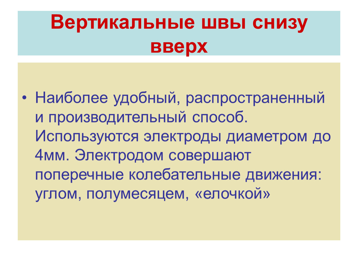 Наиболее удобный, распространенный и производительный способ. Используются электроды диаметром до 4мм. Электродом совершают поперечные колебательные движения: углом, полумесяцем, «елочкой»