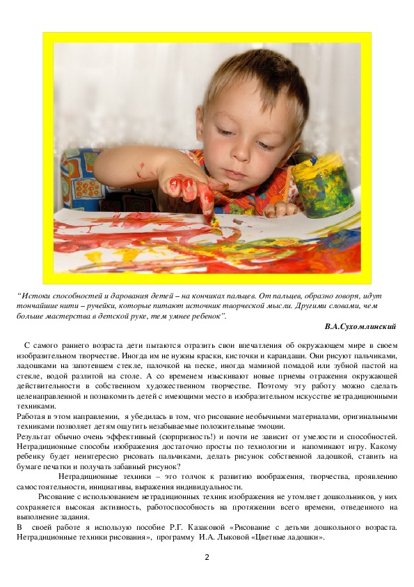 С самого раннего возраста дети пытаются отразить свои впечатления об окружающем мире в своем изобразительном творчестве. Иногда им не нужны краски, кисточки и карандаши. Они рисуют пальчиками, ладошками на запотевшем стекле, палочкой на песке, иногда маминой помадой или зубной пастой на стекле, водой разлитой на столе. А со временем изыскивают новые приемы отражения окружающей действительности в собственном художественном творчестве. Поэтому эту работу можно сделать целенаправленной и познакомить детей с имеющими место в изобразительном искусстве нетрадиционными техниками.“Истоки способностей и дарования детей – на кончиках пальцев. От пальцев, образно говоря, идут тончайшие нити – ручейки, которые питают источник творческой мысли. Другими словами, чем больше мастерства в детской руке, тем умнее ребенок”.
