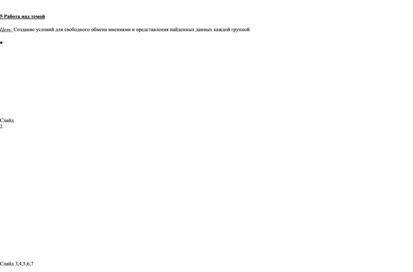 5 Работа над темой Цель: Создание условий для свободного обмена мнениями и представления найденных данных каждой группой