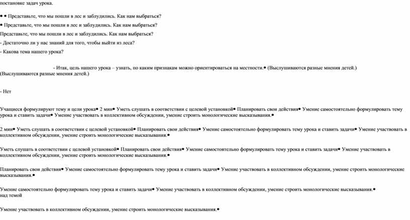 Представьте, что мы пошли в лес и заблудились. Как нам выбраться? - Достаточно ли у нас знаний для того, чтобы выйти из леса? - Какова тема нашего урока? - Итак, цель нашего урока – узнать, по каким признакам можно ориентироваться на местности. |