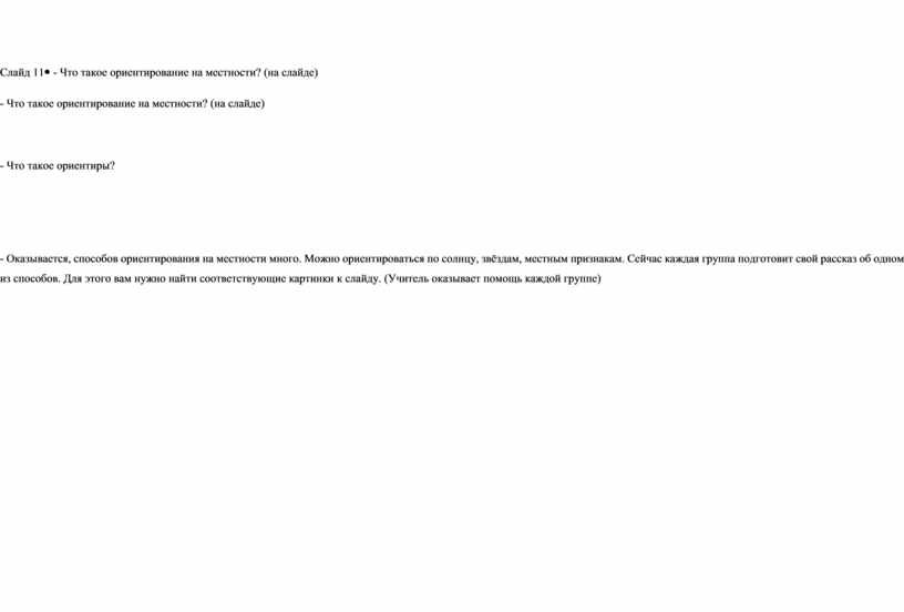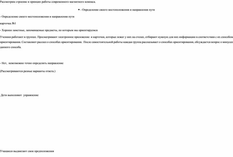 - Определение своего местоположения и направления пути карточка №1 - Хорошо заметные, запоминаемые предметы, по которым мы ориентируемся Ученики работают в группах. Просматривают электронное приложение и карточки, которые лежат у них на столах, отбирают нужную для них информацию в соответствии с их способом ориентирования. Составляют рассказ о способах ориентирования. После самостоятельной работы каждая группа рассказывает о способах ориентирования, обсуждается вопрос о минусах данного способа.