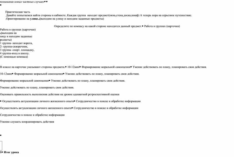 Работа в группах (карточки) .(выходим на улицу и находим заданные предметы) 1 группа- находит ворота, 2- группа-скворечник, 3 группа- спорт. площадку, 4 группа-вход в школу. (С помощью компаса)