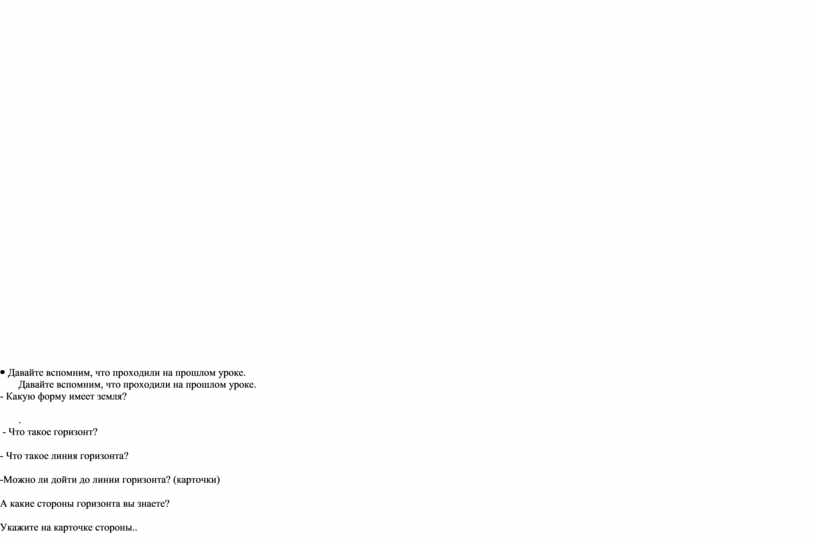 . - Что такое горизонт? - Что такое линия горизонта? -Можно ли дойти до линии горизонта? (карточки) А какие стороны горизонта вы знаете? Укажите на карточке стороны.. Покажите карточкой промежуточные стороны