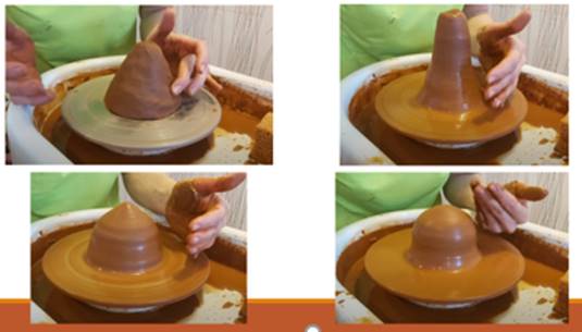 - Знать и уметь правильно ставить руки и пальцы, а также распределять усилия. Необходимо следить за вращением гончарного круга. Следить за равномерностью стенок, они должны быть одинаковой толщины. |