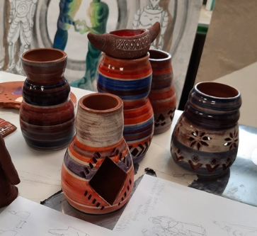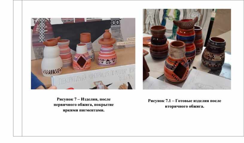 - После полного высыхания изделия отправляются на первичный обжиг. Для придания изделию окончательного вида его подвергают декорированию – процессу украшения глазурью, ангобами или росписью. Роспись ангобами выполняется на гончарном круге, чтобы придать «полосатость» изделиям. |