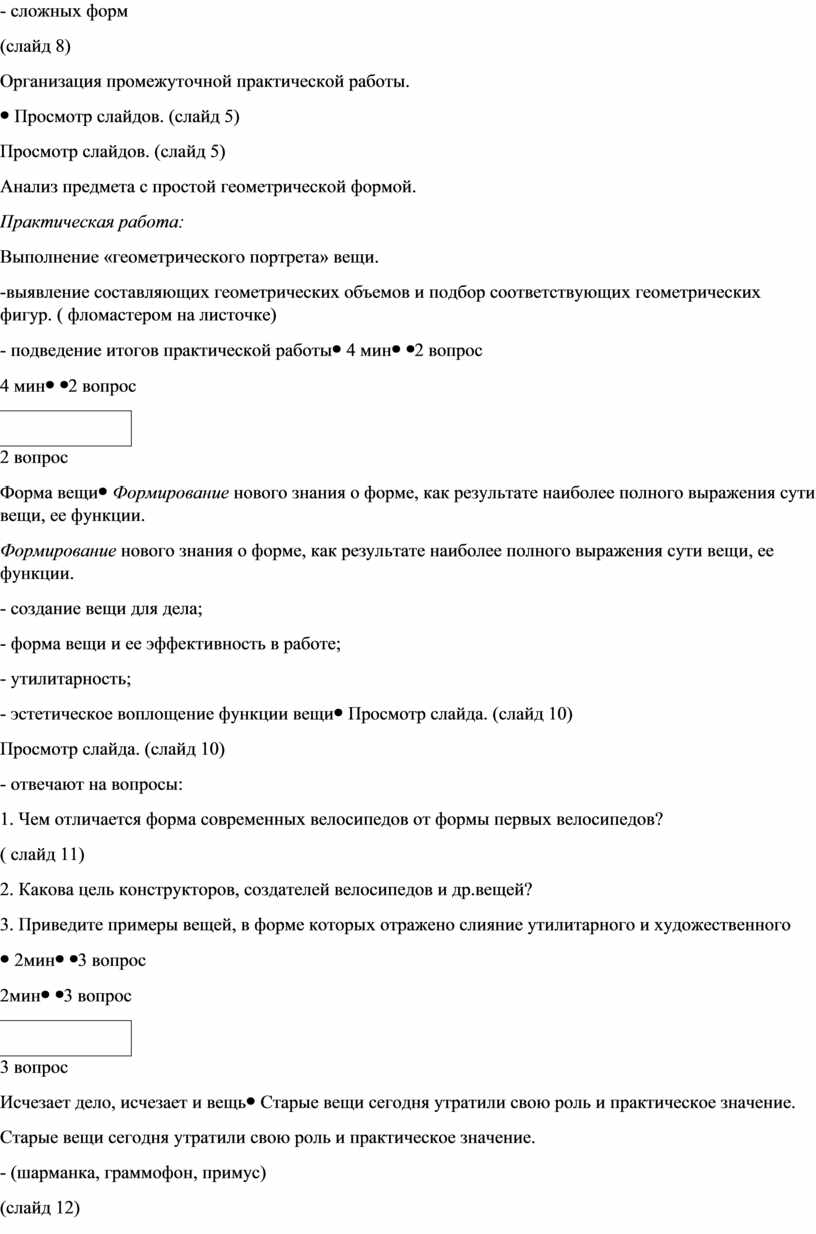 Просмотр слайда. (слайд 10) - отвечают на вопросы: 1. Чем отличается форма современных велосипедов от формы первых велосипедов? ( слайд 11) 2. Какова цель конструкторов, создателей велосипедов и др.вещей? 3. Приведите примеры вещей, в форме которых отражено слияние утилитарного и художественного