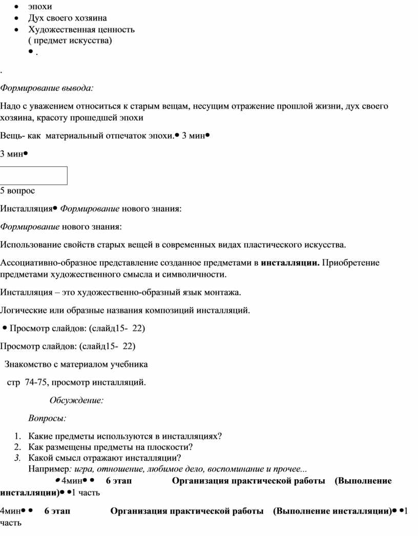 Проведена работа по сбору предметов для инсталляций каждой группой учащихся по разным темам. Рекомендации по выполнению монтажа предметов: - решение композиции - объемность Всем учащимся раздаются жетоны «симпатии» с пояснением их назначения в подведении итогов практической работы