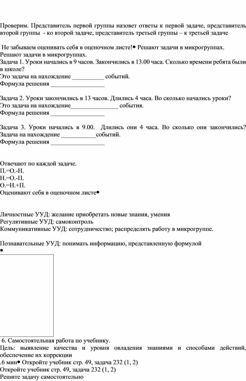 Решают задачи в микрогруппах. Задача 1. Уроки начались в 9 часов. Закончились в 13.00 часа. Сколько времени ребята были в школе? Это задача на нахождение __________ событий. Формула решения _________________