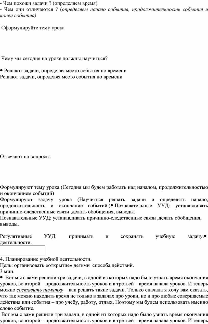 Формулируют тему урока (Сегодня мы будем работать над началом, продолжительностью и окончанием событий) Формулируют задачу урока (Научиться решать задачи и определять начало, продолжительность и окончание событий.) |