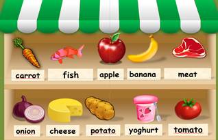-Look at the blackboard, what is it? What do you think we're going to talk about today? Right! We are going to talk about food and drinks today! Look at the screen. This is our friend Ann and she needs our help. She needs to distribute the products to the carts. Let's help her, but first let's study and remember the words.