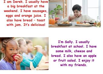 Ok, next, please look at the screen. Let’s read the text and translate. But first of all, do you know all the words? Ok, these are our friends Derek and Sally. And they want to tell us what they like to eat for breakfast. Let's read and translate. Ok, … read and translate please. Right! Good job.