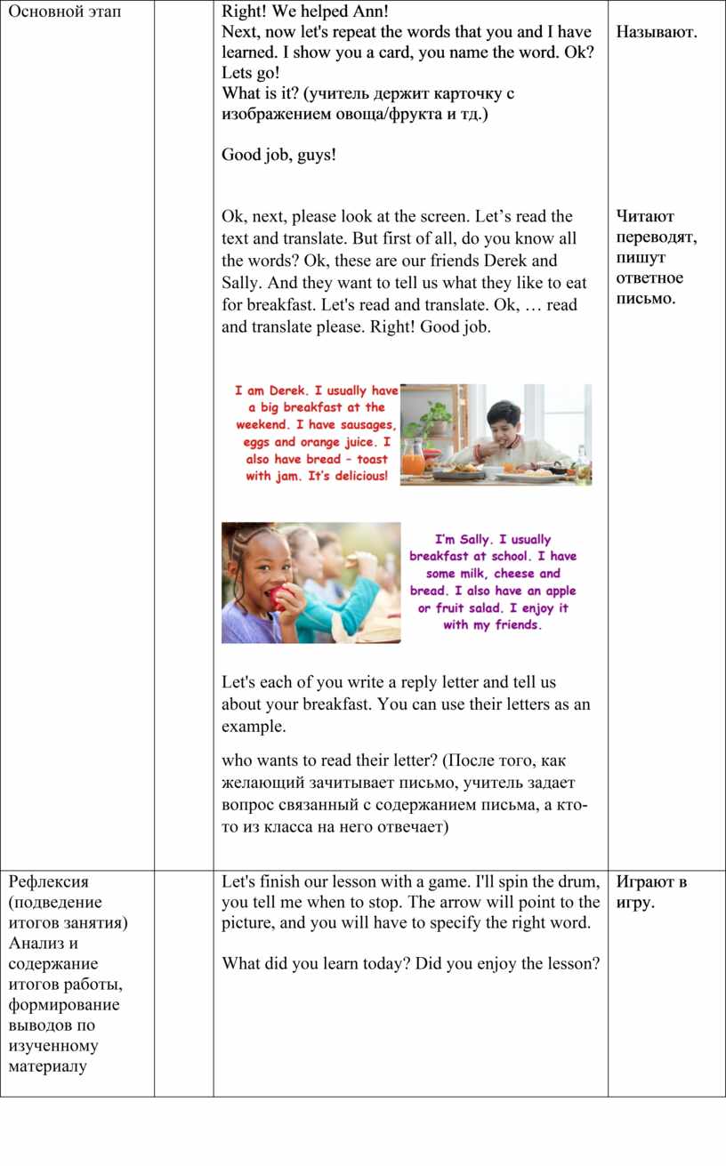 Let's each of you write a reply letter and tell us about your breakfast. You can use their letters as an example. who wants to read their letter? (После того, как желающий зачитывает письмо, учитель задает вопрос связанный с содержанием письма, а кто-то из класса на него отвечает)