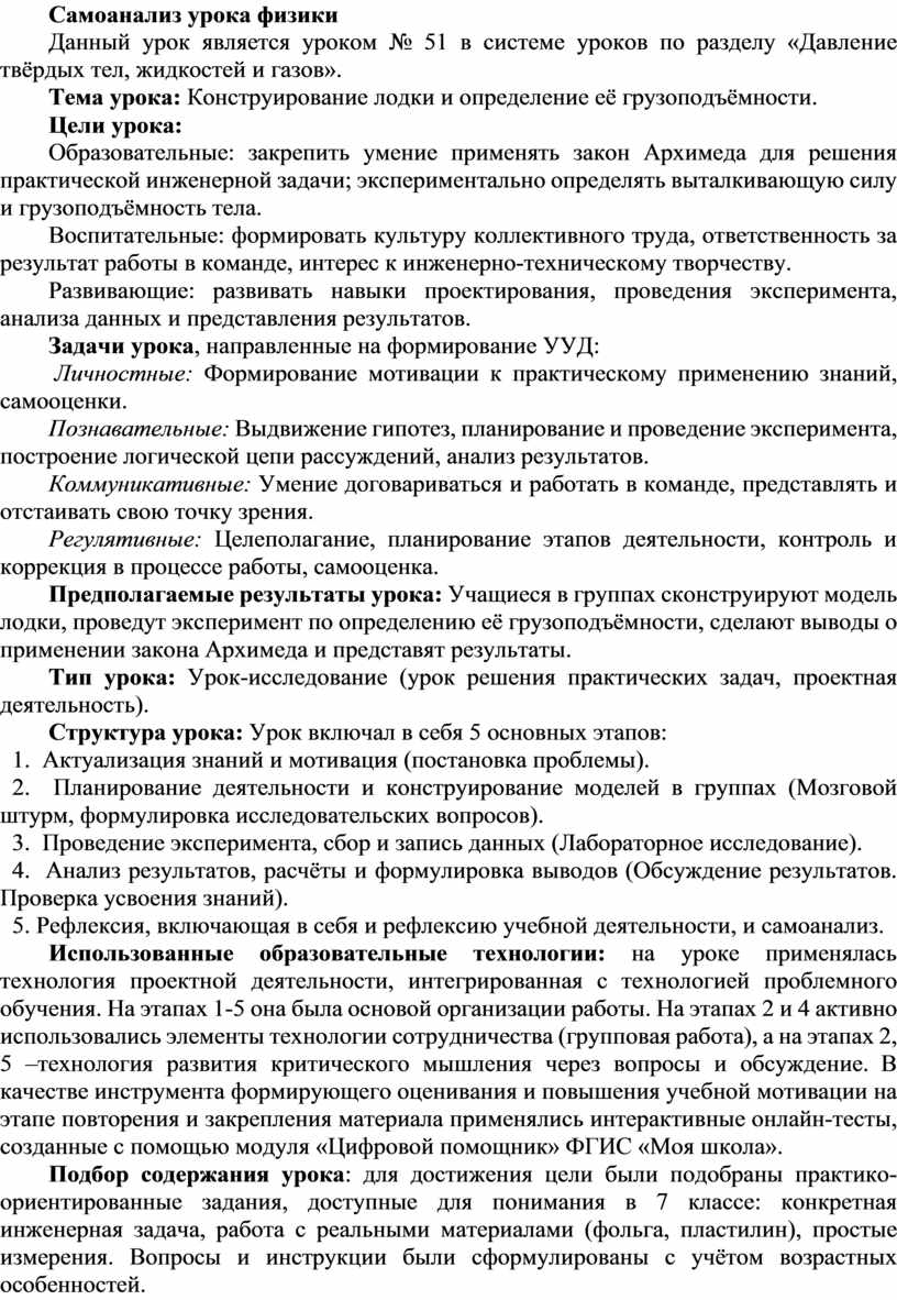 Заключительный урок по теме «Давление твёрдых тел, жидкостей и газов». Практическое применение законов Архимеда для решения инженерно-технической задачи. |