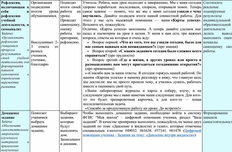 Учитель: Ребята, наш урок подходит к завершению. Мы с вами сегодня здорово поработали: исследовали, спорили, открывали новое. Теперь самое важное — понять, что же мы с вами сегодня узнали и чему научились. Давайте подведем итоги нашей совместной работы. Для этого у нас есть надежный помощник — ваши «Карты успеха». Возьмите их, пожалуйста. Отлично. «Карты успеха» заполнены. А теперь давайте сделаем шаг назад и посмотрим на урок в целом. У меня к вам есть три важных вопроса, ответы на которые я очень жду: · Вопрос первый: «Что из того, что вы узнали сегодня, было для вас самым важным или неожиданным?» (про знания) · Вопрос второй: «С каким заданием сегодня было сложнее всего справиться? (про трудности) · Вопрос третий: «Где в жизни, в других уроках или просто в размышлениях вам могут пригодиться сегодняшние открытия?» (про применение) · «Спасибо вам за ваши ответы. Я сегодня горжусь нашей работой. По вашим «Картам успеха» и нашему разговору я вижу, что главную цель мы достигли: мы не просто прошли тему, а учились думать, работать вместе и оценивать свой путь. · Ваши лабораторные журналы и карты я соберу, изучу, и на следующем уроке мы с вами наметим наши следующие шаги. Для кого-то это будет тренировочная карточка, а для кого-то — новая исследовательская задача. · Спасибо за продуктивную работу на уроке. До встречи!» |