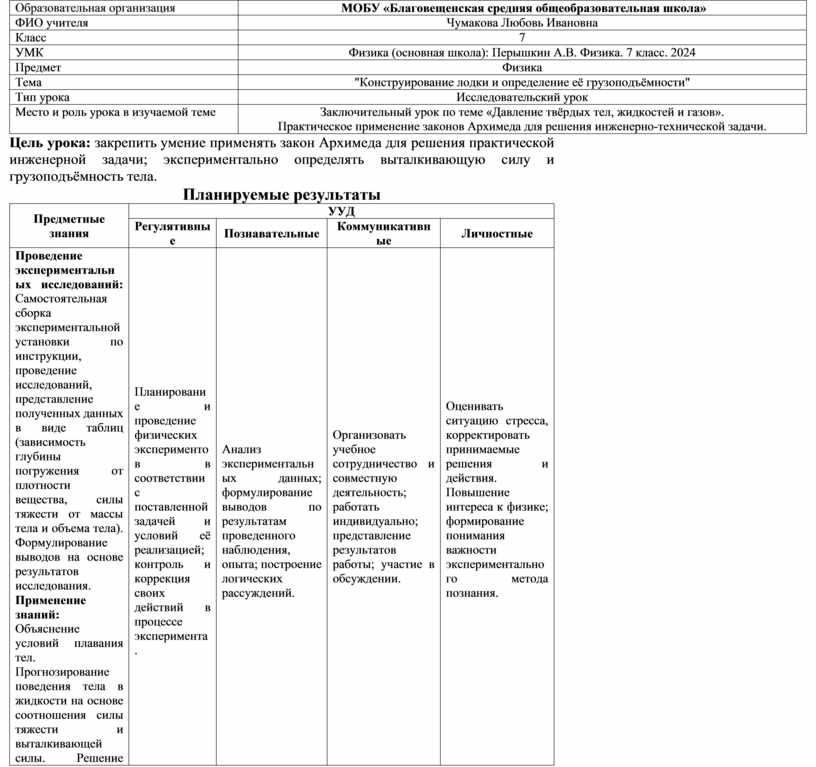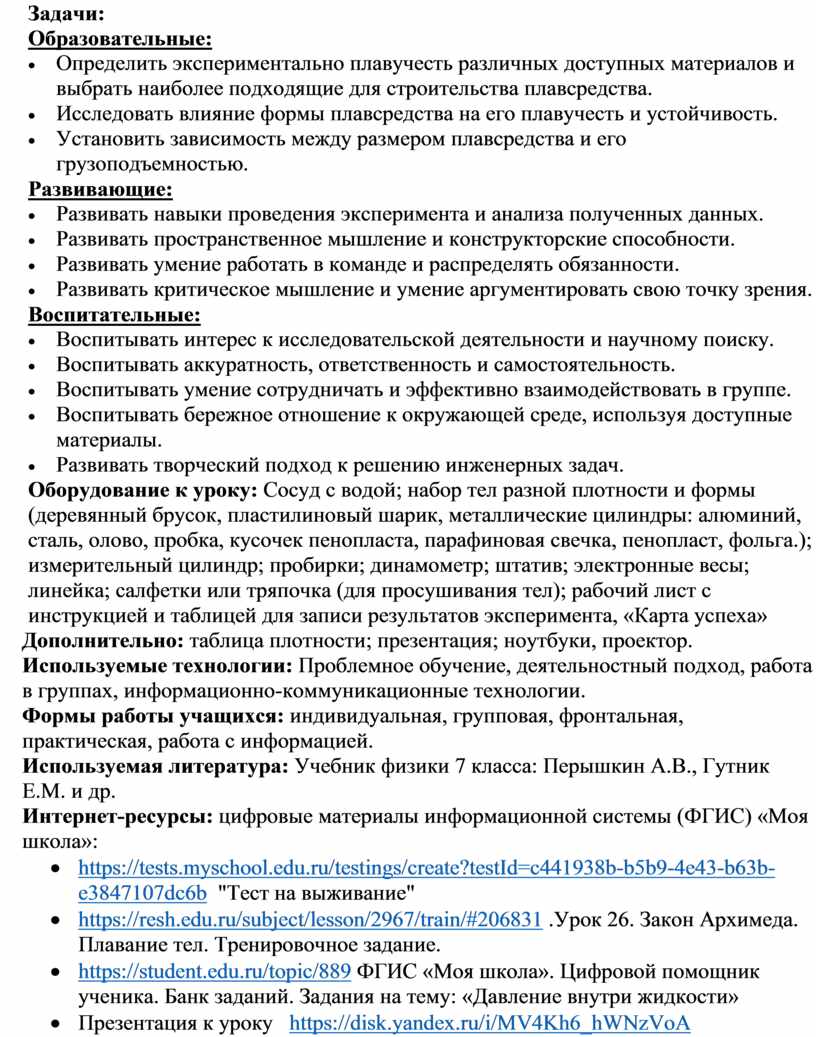 Цель урока: закрепить умение применять закон Архимеда для решения практической инженерной задачи; экспериментально определять выталкивающую силу и грузоподъёмность тела.