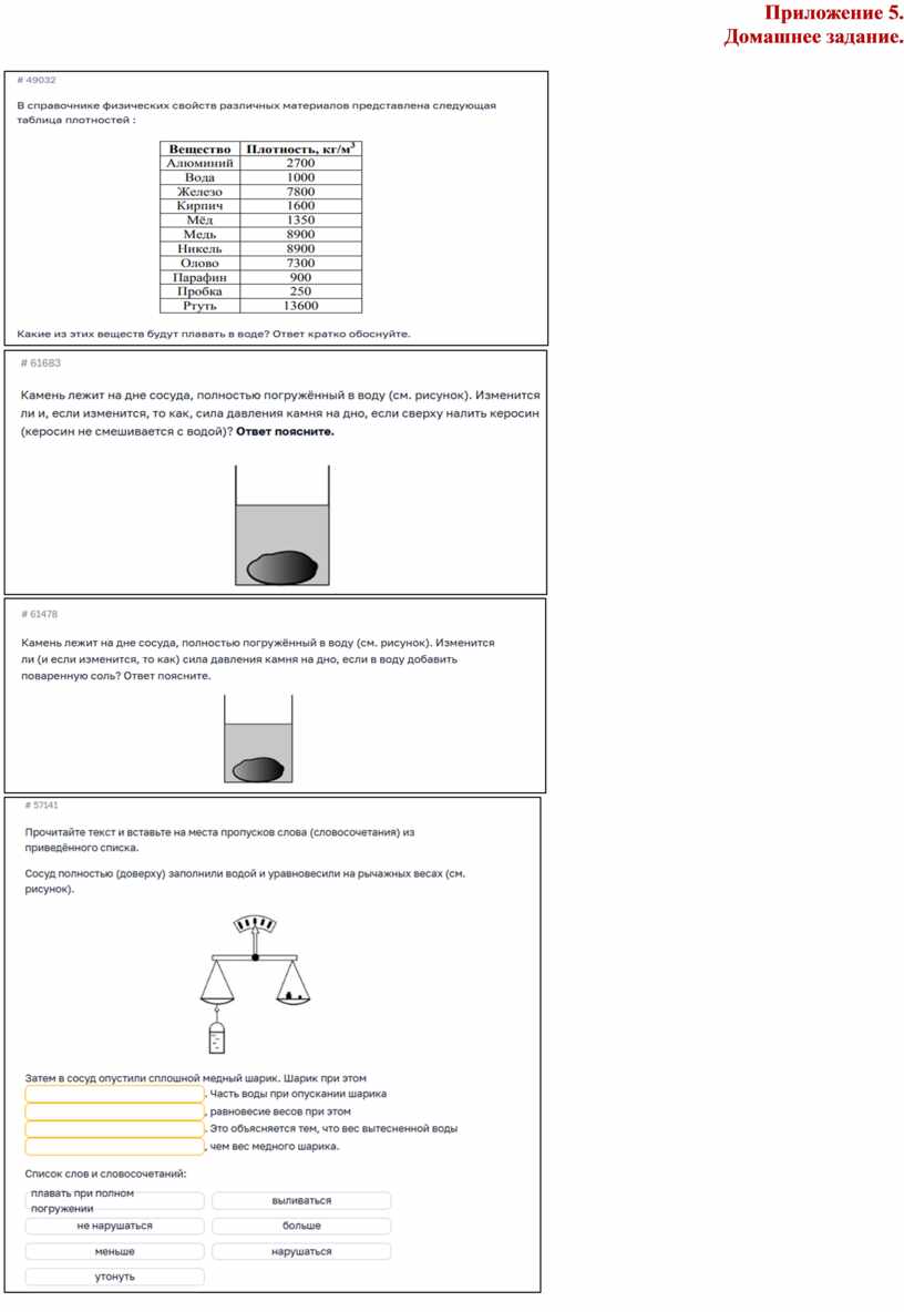 Проведение экспериментальных исследований: Самостоятельная сборка экспериментальной установки по инструкции, проведение исследований, представление полученных данных в виде таблиц (зависимость глубины погружения от плотности вещества, силы тяжести от массы тела и объема тела). Формулирование выводов на основе результатов исследования. Применение знаний: Объяснение условий плавания тел. Прогнозирование поведения тела в жидкости на основе соотношения силы тяжести и выталкивающей силы. Решение качественных задач на плавание тел. |
