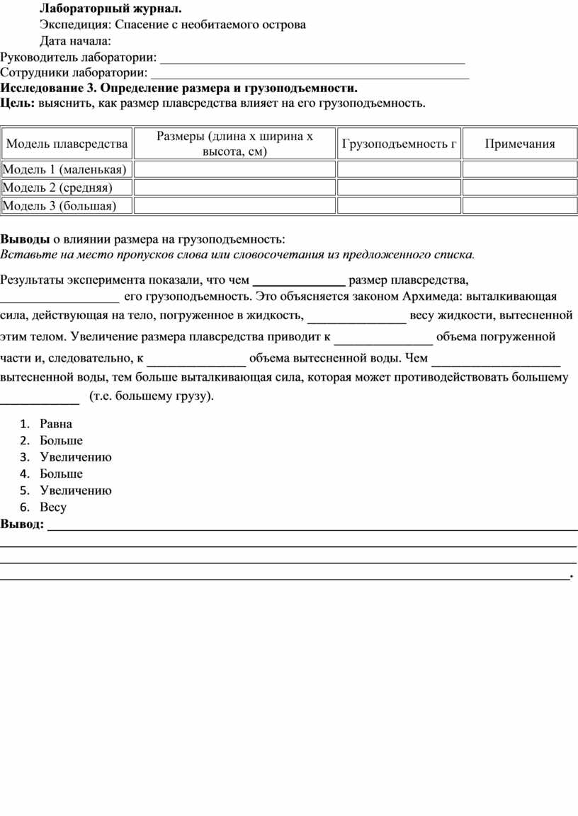Результаты эксперимента показали, что чем ______________ размер плавсредства, __________________ его грузоподъемность. Это объясняется законом Архимеда: выталкивающая сила, действующая на тело, погруженное в жидкость, __________ весу жидкости, вытесненной этим телом. Увеличение размера плавсредства приводит к __________ объема погруженной части и, следовательно, к __________ объема вытесненной воды. Чем _____________ вытесненной воды, тем больше выталкивающая сила, которая может противодействовать большему ________ (т.е. большему грузу).