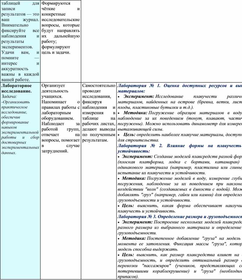 Вы придумали множество идей, и теперь нам нужно перейти к практике. А что же дальше? Наша цель — сконструировать плавсредство из доступных материалов и исследовать, как материал, форма и размер влияют на его плавучесть, устойчивость и грузоподъемность. Какие эксперименты нужны? Конечно же, те, что позволят оценить доступные ресурсы и выбрать подходящие материалы, определить влияние формы на плавучесть и устойчивость, а также выяснить размеры и грузоподъемность конструкции. Перед вами задания. Внимательно их прочитайте. На столе вы найдете оборудование, которое понадобится для проведения экспериментов. Ваша задача — выбрать нужное оборудование и правильно его использовать. Обратите внимание, что вы будете работать в группах (научных лабораториях). Руководитель лаборатории получит задание и рабочие листы с таблицей для записи результатов — это ваш журнал. Внимательно фиксируйте все наблюдения и результаты экспериментов. Удачи вам, и помните — интерес и аккуратность важны в каждой вашей работе. |