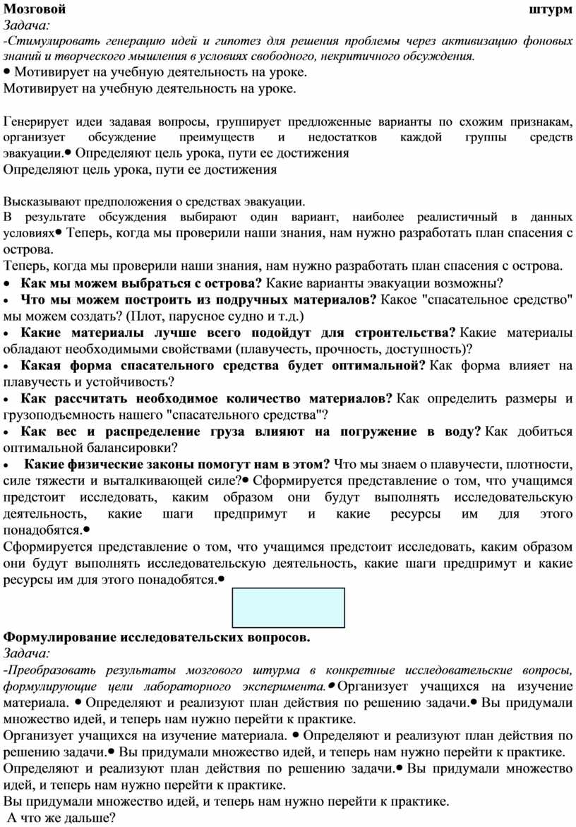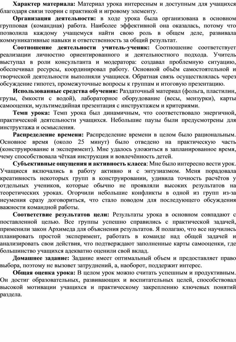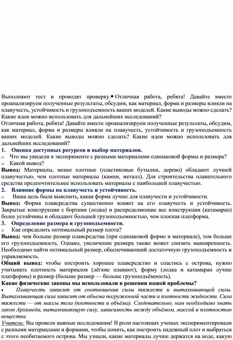 Отличная работа, ребята! Давайте вместе проанализируем полученные результаты, обсудим, как материал, форма и размеры влияли на плавучесть, устойчивость и грузоподъемность ваших моделей. Какие выводы можно сделать? Какие идеи можно использовать для дальнейших исследований? 1. Оценка доступных ресурсов и выбор материалов. o Что мы увидели в эксперименте с разными материалами одинаковой формы и размера? o Какой вывод? Вывод: Материалы, менее плотные (пластиковые бутылки, дерево) обладают лучшей плавучестью, чем плотные материалы (камни, металл). Для строительства плавательного средства предпочтительнее использовать материалы с наибольшей плавучестью. 2. Влияние формы на плавучесть и устойчивость. o Ваша цель была выяснить, какая форма лучше для плавучести и устойчивости. Вывод: Форма плавсредства существенно влияет на его плавучесть и устойчивость. Закрытые конструкции с бортами (лодка) и распределяющие вес конструкции (катамаран) более устойчивы и обладают большей грузоподъемностью, чем плоская платформа. 3. Определение размера и грузоподъемности. o Как определить оптимальный размер плота? Вывод: чем больше размер плавсредства (при одинаковой форме и материале), тем больше его грузоподъемность. Однако, увеличение размера также может снизить маневренность. Необходимо найти оптимальный размер, обеспечивающий достаточную грузоподъемность и управляемость. Общий вывод: чтобы построить хорошее плавсредство и спастись с острова, нужно учитывать плотность материалов (лёгкие плавают), форму (лодка и катамаран лучше платформы) и размер (больше размер — больше грузоподъёмность). Какие физические законы мы использовали в решении нашей проблемы? · Плавучесть зависит от соотношения силы тяжести и выталкивающей силы. Выталкивающая сила зависит от объема погруженной части и плотности жидкости. Сила тяжести — от массы тела (плотности и объёма). Следовательно, нам необходимо знать закон Архимеда, выталкивающую силу, зависимость между объёмом, массой и плотностью вещества. Учитель: Вы провели важные исследования! В роли настоящих ученых экспериментировали с разными материалами и формами, чтобы понять, как построить надежный плот и выбраться с этого необитаемого острова. Мы узнали, какие материалы лучше держатся на воде, какую форму стоит выбрать для большей устойчивости, и как размеры плавсредства влияют на вместимость запасов и пассажиров.