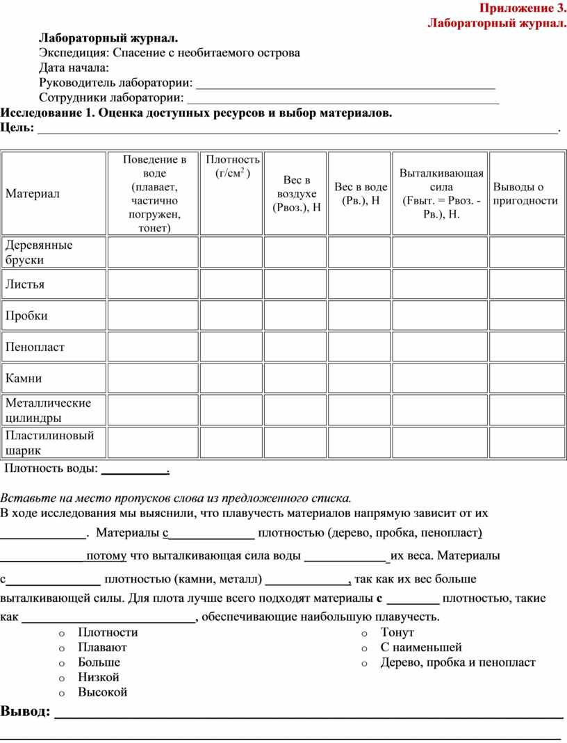 В ходе исследования мы выяснили, что плавучесть материалов напрямую зависит от их __________. Материалы с__________ плотностью (дерево, пробка, пенопласт) ___________ потому что выталкивающая сила воды ____________ их веса. Материалы с___________ плотностью (камни, металл) ___________, так как их вес больше выталкивающей силы. Для плота лучше всего подходят материалы с _______ плотностью, такие как _______________________, обеспечивающие наибольшую плавучесть.