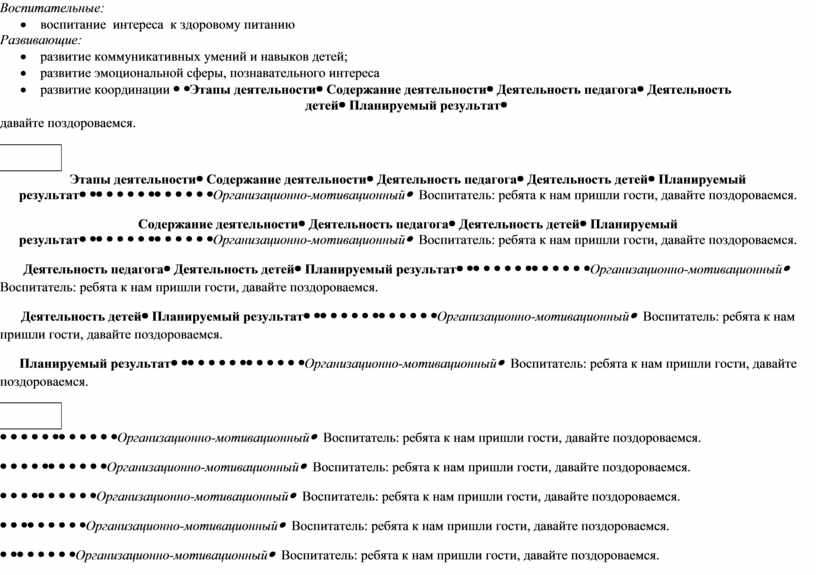Дети физически развиты: дети повышают и стимулируют свои физические навыки по средствами физ.минуток любознательны, активны: во время занятия воспитатель поощряет инициативность детей, так же дети активно отвечают на вопросы овладевают средствами общения и способами взаимодействия со взрослыми и сверстниками: воспитатель поддерживает конструктивное общение с детьми во время занятия способны управлять своим поведением и планировать свои действия на основе первичных ценностных представлений, соблюдающий элементарные общепринятые нормы и правила поведения: дети соблюдают правила поведения в конкретных ситуациях способные решать интеллектуальные и личностные задачи: дети размышляют в игре «Полезная и вредная пища» имеют первичные представления о себе, семье, обществе, государстве, мире и природе: на занятии дети демонстрируют знания о здоровье, полезных и вредных продуктах питания, узнают новую информацию о витаминах и их влиянии на организм человека. овладевают универсальными предпосылками учебной деятельности: дети анализируют наглядный материал, распределяют вредную и здоровую пищу, развивают речевую активность овладевают необходимыми умениями и навыками: дети развивают свой пассивный и активный словарь, по средствам беседы воспитателя о витаминах,продуктах питания |