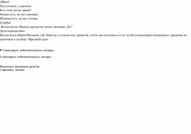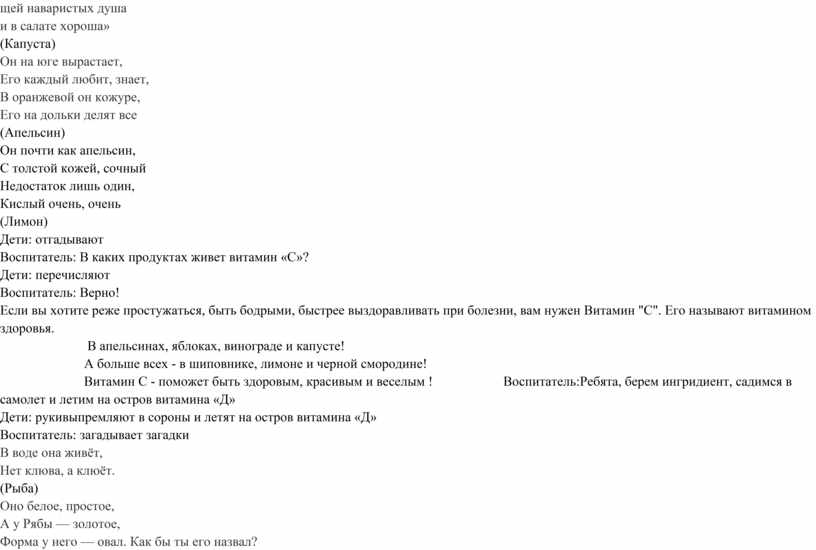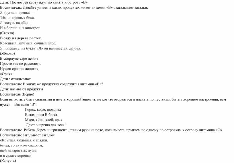 3.Белое, да не снег Вкусное, да не мед, От коровушки берут, да ребяткам дают (Молоко) Дети: отгадывают Воспитатель: В каких же продуктах живет витамин «А» Дети : Морковь, помидор, молоко Воспитатель :Верно! Если вы хотите хорошо расти, хорошо видеть и иметь крепкие зубы, вам нужен - Витамин "А". Ещё его зовут витамином роста. Его больше всего в морковке, Есть и в тыкве, абрикосах, В персиках, в арбузе тоже. Много его в молоке и яичном желтке! Воспитатель: Берем первый ингридиент и отправляемся на остров витамина «В» Дети: Посмотрев карту идут по канату к острову «В» Воспитатель: Давайте узнаем в каких продуктах живет витамин «В» , загадывает загадки: Я кругла и крепка — (Свекла) В саду на дереве растёт. Красивый, вкусный, сочный плод. Я подскажу: на букву «Я» он начинается, друзья. (Яблоко) В скорлупе едро лежит Просто так не расколоть, Нужен срочно молоток «Орех» Дети : отгадывают Воспитатель: В каких же продуктах содержится витамин «В»? Дети: называют продукты Воспитатель :Верно! Если вы хотите быть сильными и иметь хороший аппетит, не хотите огорчаться и плакать по пустякам, быть в хорошем настроении, вам нужен Витамин "В". Горох, кофе, шоколад Витамином В богат. Мясо, яйца, хлеб, орех Дают энергию для всех! Воспитатель: Ребята ,берем ингридиент , ставим руки на пояс, ноги вместе, прыгаем по одному по островкам к острову витамина «С» Воспитатель: загадывает загадки: «Круглая, большая, с грядки, (Капуста) Он на юге вырастает, (Апельсин) Он почти как апельсин, С толстой кожей, сочный Недостаток лишь один, Кислый очень, очень (Лимон) Дети: отгадывают Воспитатель: В каких продуктах живет витамин «С»? Дети: перечисляют Воспитатель: Верно! Если вы хотите реже простужаться, быть бодрыми, быстрее выздоравливать при болезни, вам нужен Витамин "С". Его называют витамином здоровья. В апельсинах, яблоках, винограде и капусте! А больше всех - в шиповнике, лимоне и черной смородине! Витамин С - поможет быть здоровым, красивым и веселым ! Воспитатель:Ребята, берем ингридиент, садимся в самолет и летим на остров витамина «Д» Дети: рукивыпремляют в сороны и летят на остров витамина «Д» Воспитатель: загадывает загадки В воде она живёт, (Рыба) Оно белое, простое, (Яйцо) Под сосною у дорожки Кто стоит возле травы? Ножка есть, но нет саможка, Шляпка есть, но нет головы. (Грибы) Воспитатель: Вкаких продуктах живет витамин «Д»? Дети:перечисляют Воспитатель:Верно!Витамин «Д» борется с усталостью, тревогой, летом мы получаем его из лучей солнца.Берем ингридиент, крадемся на цыпочках к острову «Вредной еды»