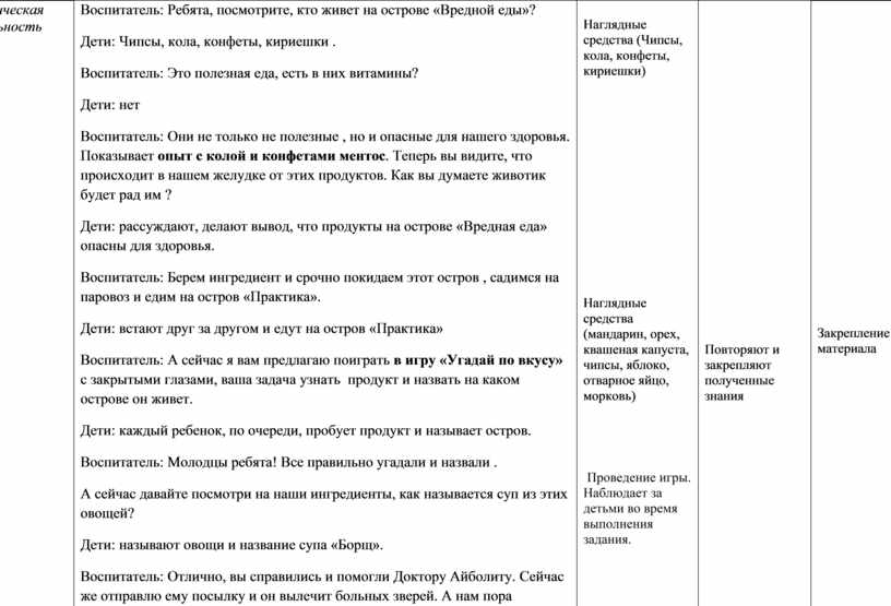 Воспитатель: Ребята, посмотрите, кто живет на острове «Вредной еды»? Дети: Чипсы, кола, конфеты, кириешки . Воспитатель: Это полезная еда, есть в них витамины? Дети: нет Воспитатель: Они не только не полезные , но и опасные для нашего здоровья. Показывает опыт с колой и конфетами ментос. Теперь вы видите, что происходит в нашем желудке от этих продуктов. Как вы думаете животик будет рад им ? Дети: рассуждают, делают вывод, что продукты на острове «Вредная еда» опасны для здоровья. Воспитатель: Берем ингредиент и срочно покидаем этот остров , садимся на паровоз и едим на остров «Практика». Дети: встают друг за другом и едут на остров «Практика» Воспитатель: А сейчас я вам предлагаю поиграть в игру «Угадай по вкусу» с закрытыми глазами, ваша задача узнать продукт и назвать на каком острове он живет. Дети: каждый ребенок, по очереди, пробует продукт и называет остров. Воспитатель: Молодцы ребята! Все правильно угадали и назвали . А сейчас давайте посмотри на наши ингредиенты, как называется суп из этих овощей? Дети: называют овощи и название супа «Борщ». Воспитатель: Отлично, вы справились и помогли Доктору Айболиту. Сейчас же отправлю ему посылку и он вылечит больных зверей. А нам пора возвращаться в детский сад, повторяйте за мной « Покрутись, повертись, в детский садик воротись» Дети : повторяют и кружатся вокруг себя. |