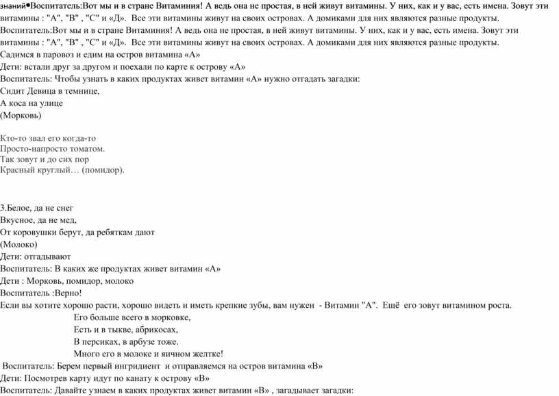 Воспитатель:Вот мы и в стране Витаминия! А ведь она не простая, в ней живут витамины. У них, как и у вас, есть имена. Зовут эти витамины : "А", "В" , "С" и «Д». Все эти витамины живут на своих островах. А домиками для них являются разные продукты. Садимся в паровоз и едим на остров витамина «А» Дети: встали друг за другом и поехали по карте к острову «А» Воспитатель: Чтобы узнать в каких продуктах живет витамин «А» нужно отгадать загадки: Сидит Девица в темнице, А коса на улице (Морковь) ·