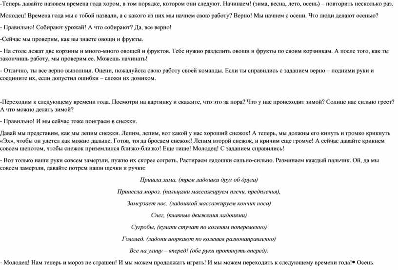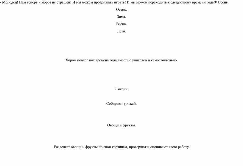 улице время года? -Теперь давайте назовем времена года хором, в том порядке, котором они следуют. Начинаем! (зима, весна, лето, осень) – повторить несколько раз. Молодец! Времена года мы с тобой назвали, а с какого из них мы начнем свою работу? Верно! Мы начнем с осени. Что люди делают осенью? - Правильно! Собирают урожай! А что собирают? Да, все верно! -Сейчас мы проверим, как вы знаете овощи и фрукты. - На столе лежат две корзины и много-много овощей и фруктов. Тебе нужно разделить овощи и фрукты по своим корзинкам. А после того, как ты закончишь работу, мы проверим ее. Можешь начинать! - Отлично, ты все верно выполнил. Оцени, пожалуйста свою работу своей команды. Если ты справились с заданием верно – подними руки и соедините их, если допустил ошибки – сложи их домиком.