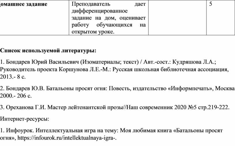 1. Инфоурок. Интеллектуальная игра на тему: Моя любимая книга «Батальоны просят огня», https://infourok.ru/intellektualnaya-igra-.
