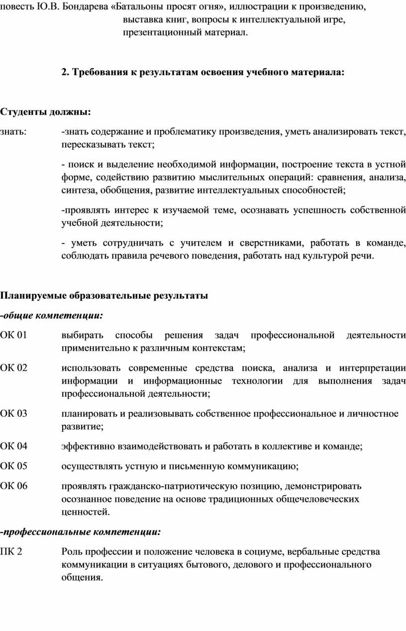 обеспечение: Рабочая программа общеобразовательной дисциплины Литература;