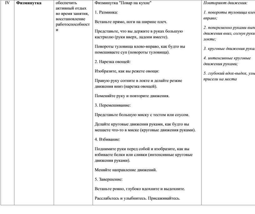 Физминутка "Повар на кухне" 1. Разминка: Встаньте прямо, ноги на ширине плеч. Представьте, что вы держите в руках большую кастрюлю (руки вверх, ладони вместе). Повороты туловища влево-вправо, как будто вы помешиваете суп (повороты туловища). 2. Нарезка овощей: Изобразите, как вы режете овощи: Правую руку согните в локте и делайте резкие движения вниз (нарезка овощей). Поменяйте руку и повторите движения. 3. Перемешивание: Представьте большую миску с тестом или соусом. Делайте круговые движения руками, как будто вы мешаете что-то в миске (круговые движения руками). 4. Взбивание: Поднимите руки перед собой и изобразите, как вы взбиваете белки или сливки (интенсивные круговые движения руками). Меняйте направление движений. 5. Завершение: Встаньте ровно, глубоко вдохните и выдохните. Расслабьтесь и улыбнитесь. Присаживайтесь. |