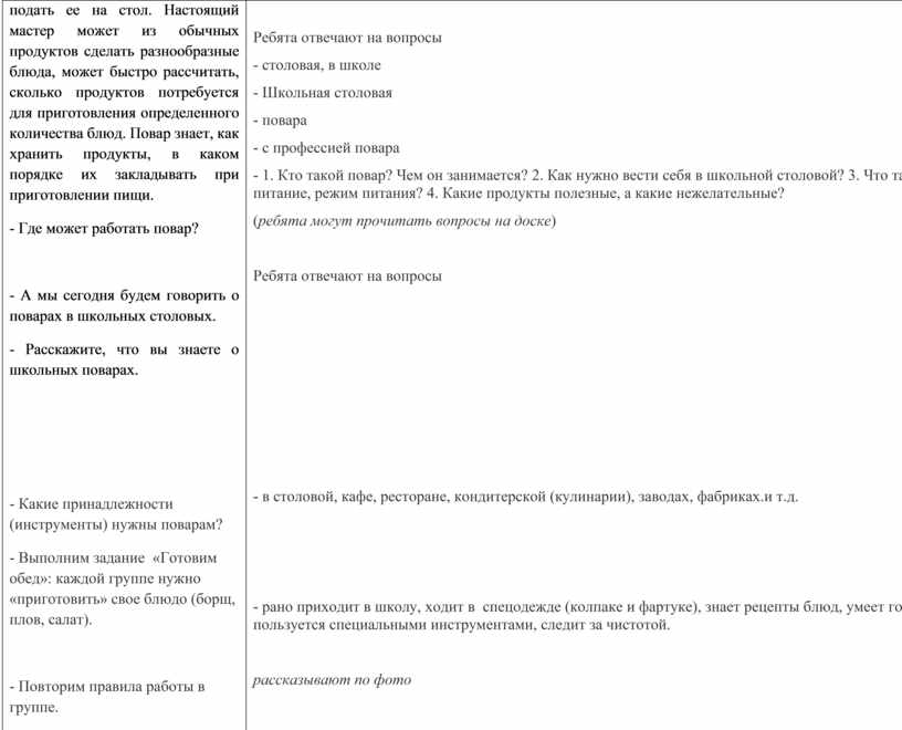 - Сегодня на нашем занятии мы познакомимся с еще одной школьной профессией. А какой, вы поймете, рассмотрев фото на доске. - Что изображено на фото? - Так какая же тема нашего сегодняшнего занятия? - А кто работает в школьной столовой? - С какой профессией мы с вами сегодня познакомимся? - Ребята, как вы думаете, на какие вопросы мы сегодня будем отвечать? (учитель помогает сформулировать вопросы)