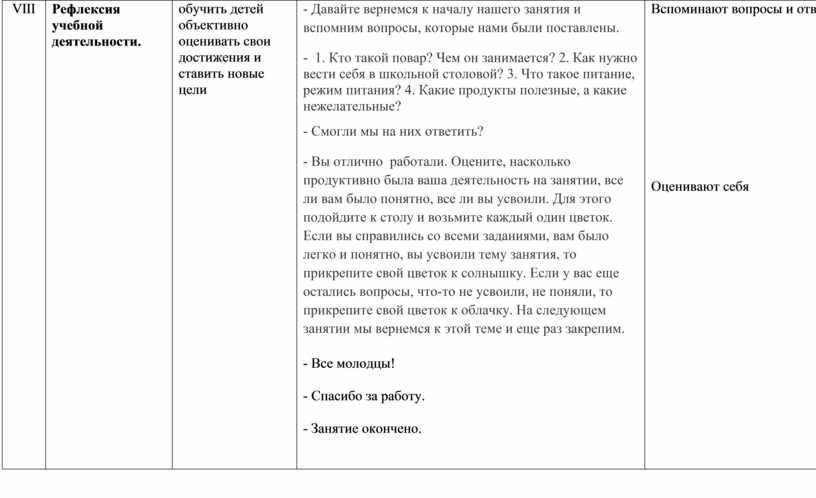 - Давайте вернемся к началу нашего занятия и вспомним вопросы, которые нами были поставлены. - 1. Кто такой повар? Чем он занимается? 2. Как нужно вести себя в школьной столовой? 3. Что такое питание, режим питания? 4. Какие продукты полезные, а какие нежелательные? - Смогли мы на них ответить? - Вы отлично работали. Оцените, насколько продуктивно была ваша деятельность на занятии, все ли вам было понятно, все ли вы усвоили. Для этого подойдите к столу и возьмите каждый один цветок. Если вы справились со всеми заданиями, вам было легко и понятно, вы усвоили тему занятия, то прикрепите свой цветок к солнышку. Если у вас еще остались вопросы, что-то не усвоили, не поняли, то прикрепите свой цветок к облачку. На следующем занятии мы вернемся к этой теме и еще раз закрепим. - Все молодцы! - Спасибо за работу. - Занятие окончено.