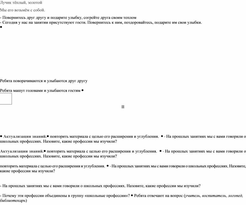 - Здравствуйте, ребята! Наше занятие я хочу начать стихотворением. Утром солнышко проснулось, Всем ребятам улыбнулось. Лучик тёплый, золотой Мы его возьмём с собой. - Повернитесь друг другу и подарите улыбку, согрейте друга своим теплом - Сегодня у нас на занятии присутствуют гости. Повернитесь к ним, поздоровайтесь, подарите им свои улыбки.