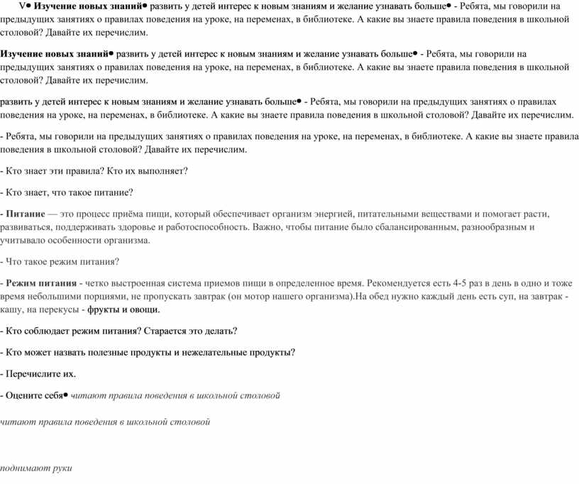 - Ребята, мы говорили на предыдущих занятиях о правилах поведения на уроке, на переменах, в библиотеке. А какие вы знаете правила поведения в школьной столовой? Давайте их перечислим. - Кто знает эти правила? Кто их выполняет? - Кто знает, что такое питание? - Питание — это процесс приёма пищи, который обеспечивает организм энергией, питательными веществами и помогает расти, развиваться, поддерживать здоровье и работоспособность. Важно, чтобы питание было сбалансированным, разнообразным и учитывало особенности организма. - Что такое режим питания? - Режим питания - четко выстроенная система приемов пищи в определенное время. Рекомендуется есть 4-5 раз в день в одно и тоже время небольшими порциями, не пропускать завтрак (он мотор нашего организма).На обед нужно каждый день есть суп, на завтрак - кашу, на перекусы - фрукты и овощи. - Кто соблюдает режим питания? Старается это делать? - Кто может назвать полезные продукты и нежелательные продукты? - Перечислите их. - Оцените себя |
