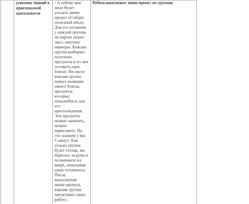 - А сейчас вам надо будет создать мини-проект «Собери полезный обед». Для его создания у каждой группы на партах лежит лист, цветные маркеры. Каждая группа выбирает полезные продукты и из них готовить свое блюдо. На листе каждая группа пишет название своего блюда, продукты, которые понадобятся для его приготовления. Эти продукты можно записать, можно нарисовать. На это задание у вас 5 минут. Как только группа будет готова, вы беретесь за руки и поднимаете их вверх, показывая свою готовность. После выполнения мини-проекта, каждая группа представит свою работу.