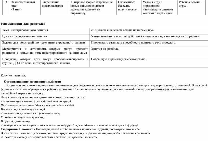 Планируемый результат занятия: ребенок узнает пирамидку, играет с колечками в свободной игре.
